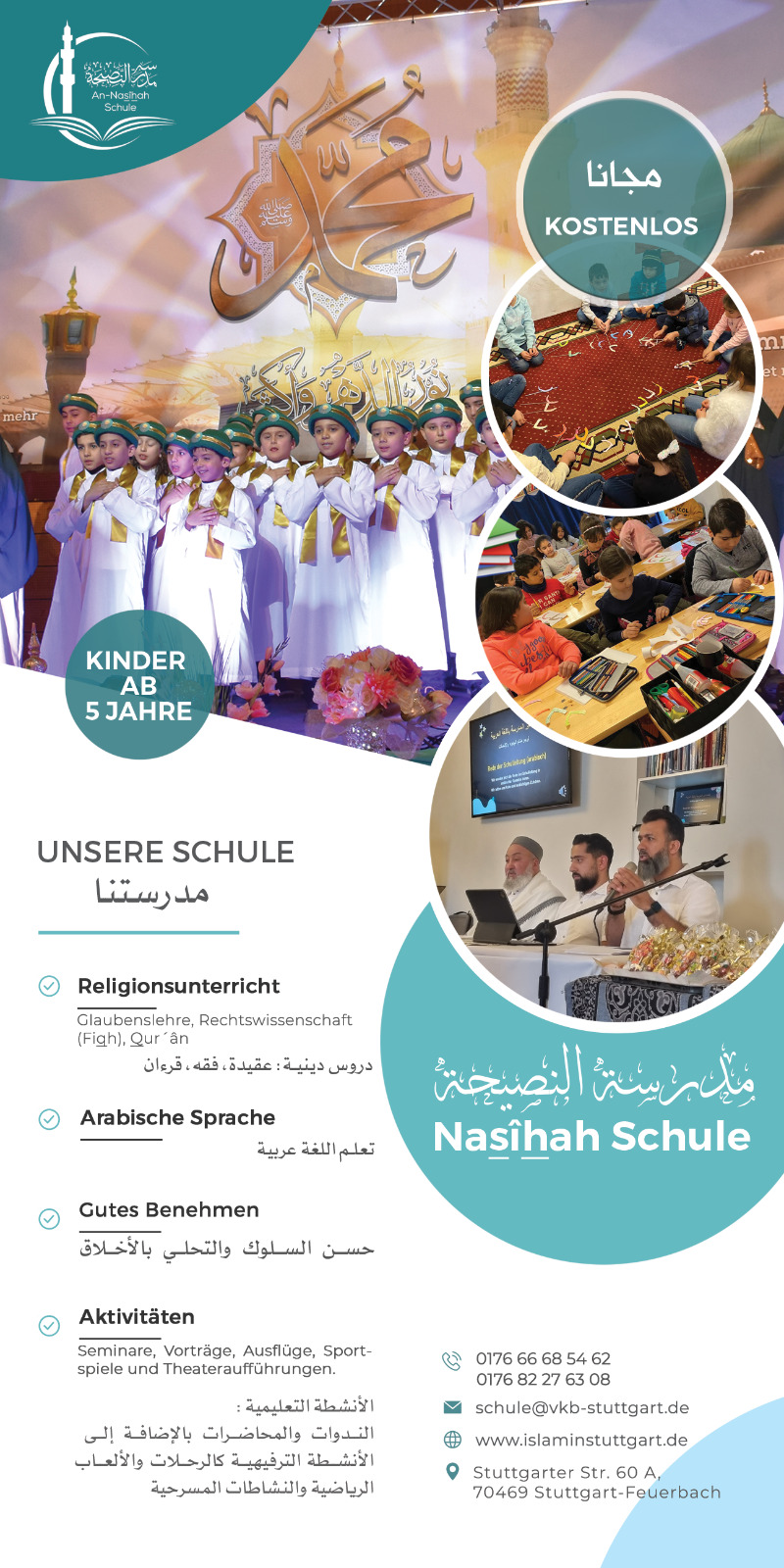 In der Nasîhah Schule haben Kinder ab 5 Jahren, Jugendliche und Erwachsene die Möglichkeit, die arabische Sprache zu lernen sowie sich das islamische Pflichtwissen anzueignen und einige Suwar des edlen Qur´ân und Aussagen unseres geehrten Propheten Muhammad, Salla l-Lâhu ^alayhi wasallam auswendig zu lernen. |
