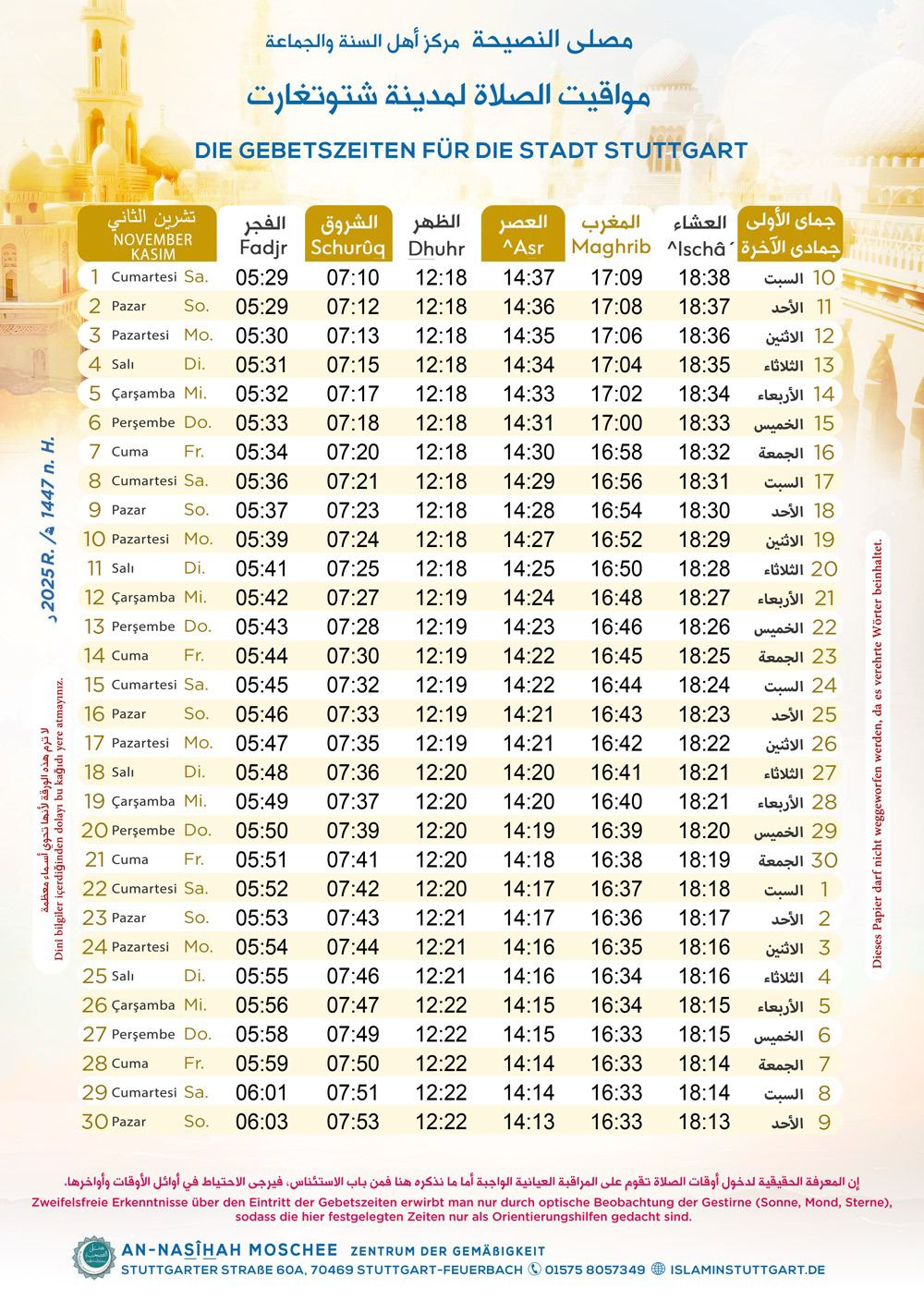 Dank gebührt ALLÂH, dem Erhabenen. Möge ALLÂH uns vor dem Begehen von Sünden beschützen. Derjenige, der von Gott rechtgeleitet wurde, wird nicht in die Irre gehen und derjenige, der von Gott in die Irre geleitet wurde, wird keine Rechtleitung finden. Ich bezeuge, dass es keinen Gott außer ALLÂH gibt, der Einzige, Der keinen Teilhaber hat und Dem nichts und niemand gleicht. Derjenige, Der keine Gestalt, keine Form und keine Glieder hat. Derjenige, Der kein Körper ist und keine Maße hat. Derjenige, Der ohne Ort existiert. Und ich bezeuge, dass unser geehrter, geliebter und großartiger Prophet Muhammad, Diener und Gesandter Gottes ist. As-Salâtu und as-Salâmu für dich, o Gesandter von ALLÂH, und für alle anderen Propheten.